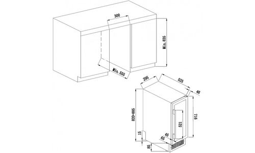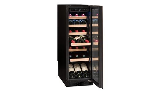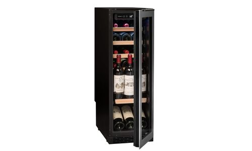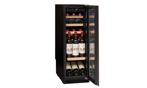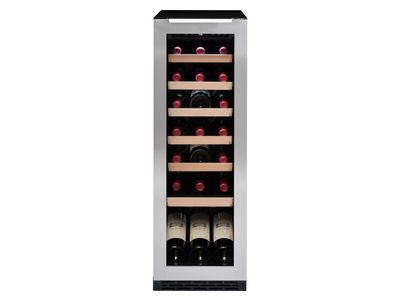 24 Flessen, onderbouwbaar of vrijstaand, 1 zone mono-T° (5-20°C), elektronische regeling en digitale display , omkeerbare glazen deur anti- UV 3 filters & inox kader, 1 metalen legger met houten front half uitschuifbaar + 5 halve metalen leggers met houten front half uitschuifbaar, plaatsing van 2 flessen vertikaal. LED-verlichting, Greeplijst bovenaan de deur