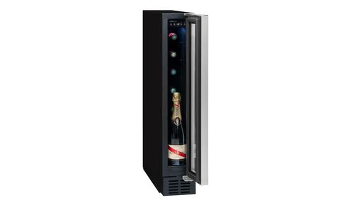 8 Flessen, onderbouwbaar of vrijstaand , 1 zone mono-T° (5-20°C), elektronische regeling en digitale display , omkeerbare glazen deur anti- UV 3 filters & inox kader , 6 vaste metalen leggers. LED-verlichting. Greeplijst bovenaan de deur.