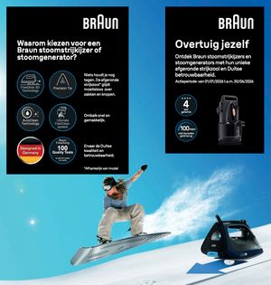 Actievoorwaarden actie ‘4 jaar garantie’: • Deze actie is geldig voor particuliere klanten bij aankoop van een stoomstrijkijzer of stoomgenerator van Braun* vanaf 1 januari 2026 t.e.m. 30 juni 2026. |