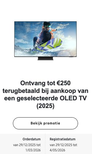 | Samsung Ontvang tot €250 terugbetaald bij aankoop van een geselecteerde OLED TV (2025) | |